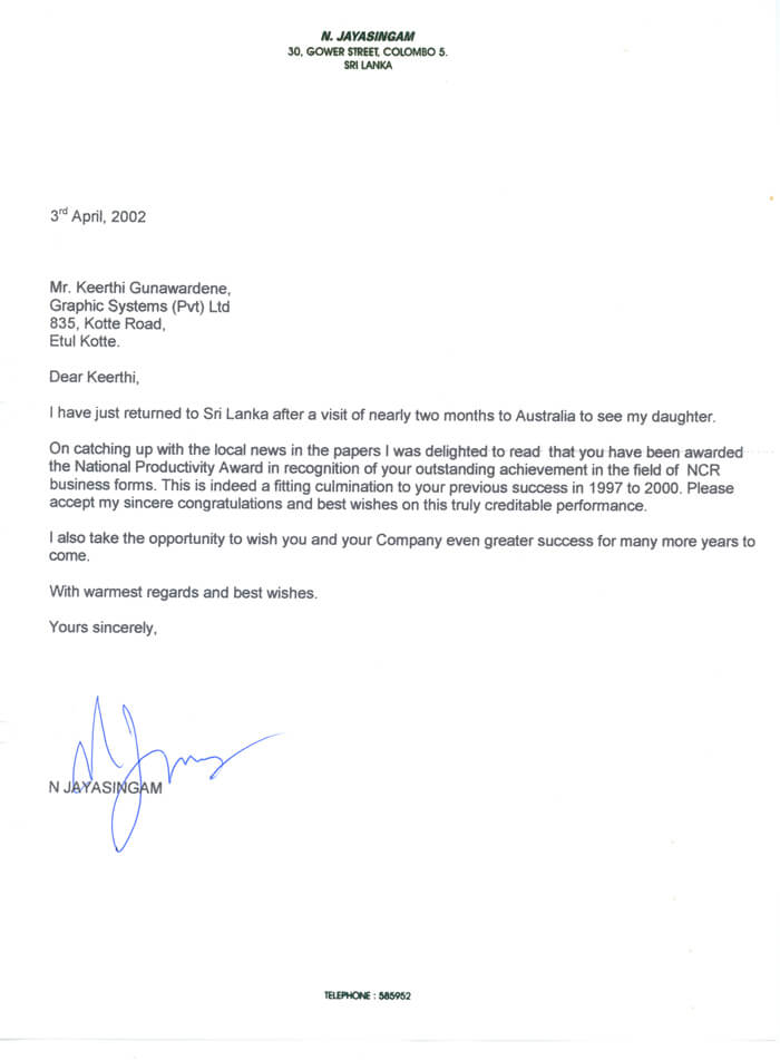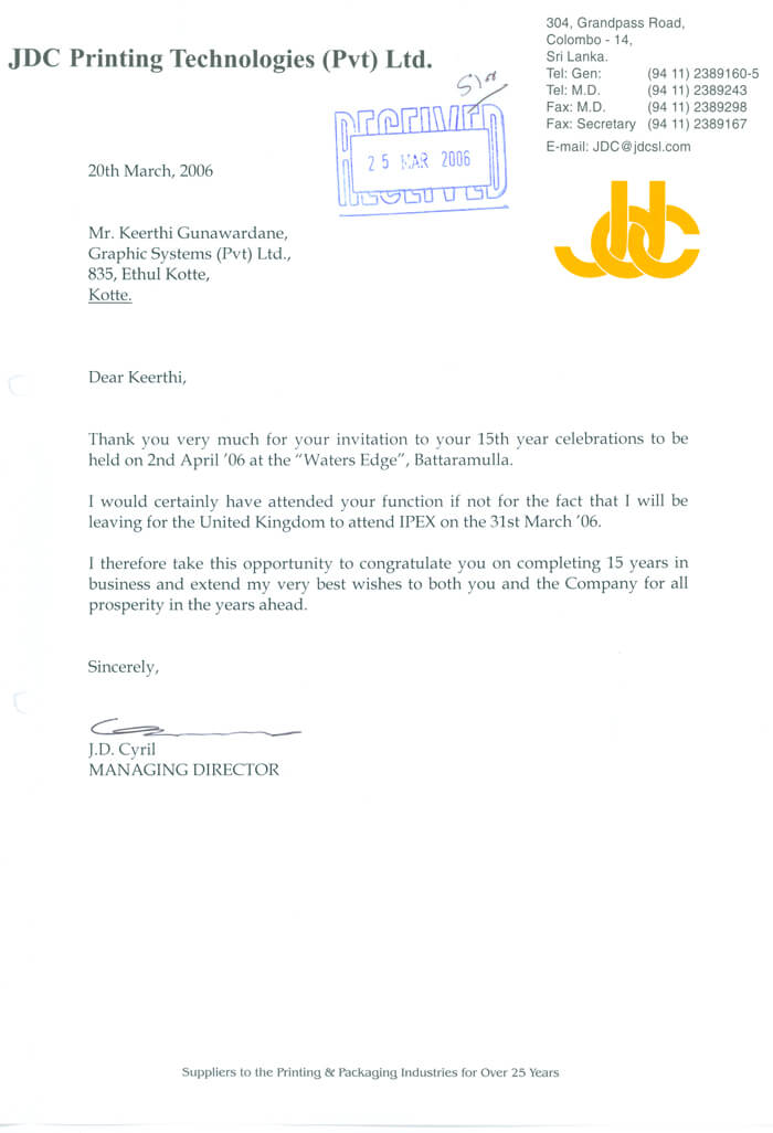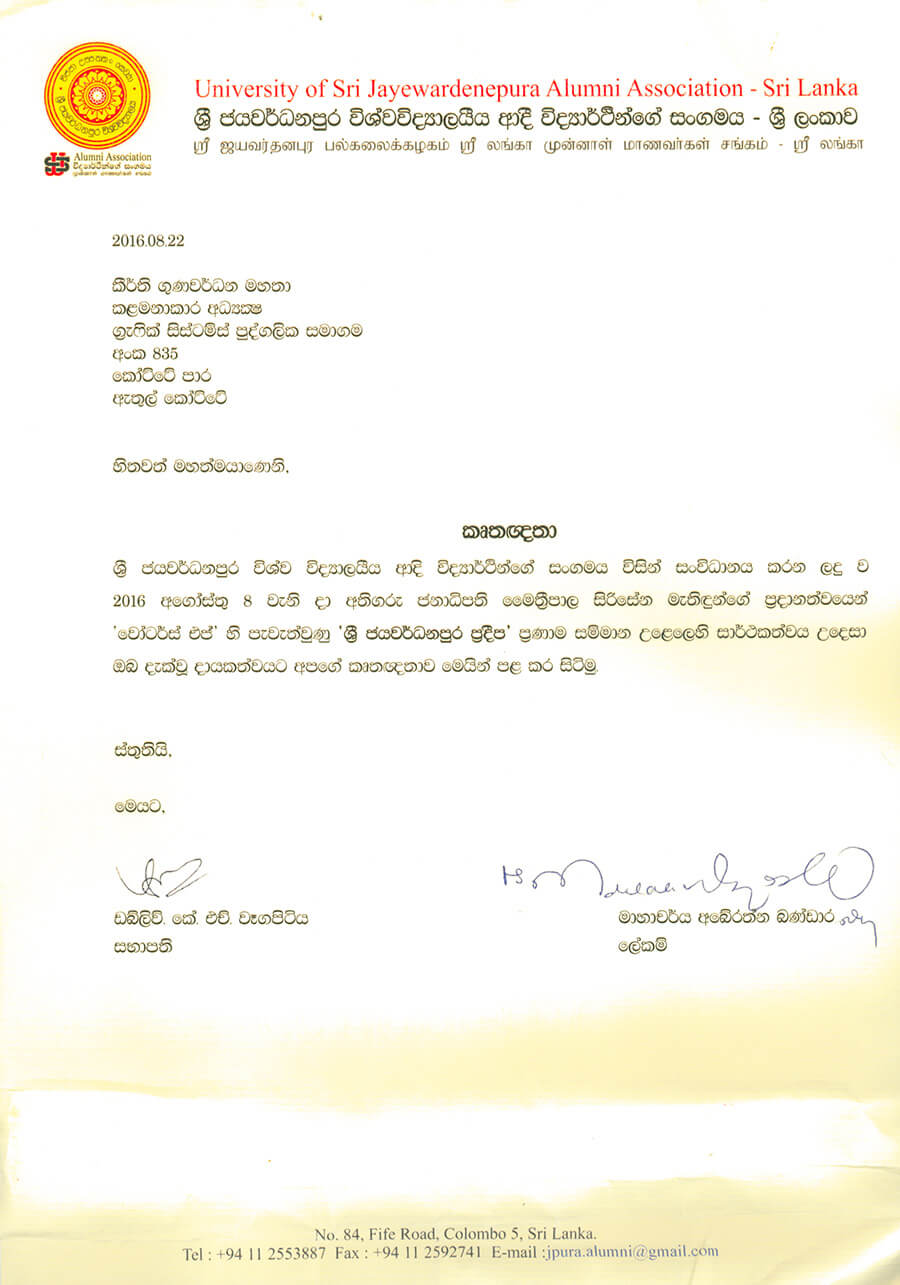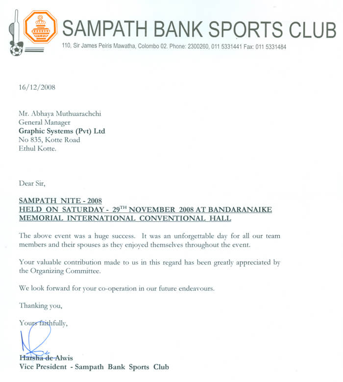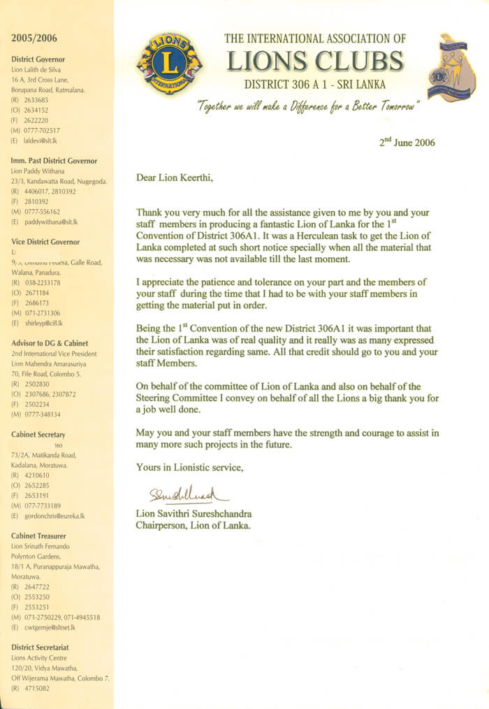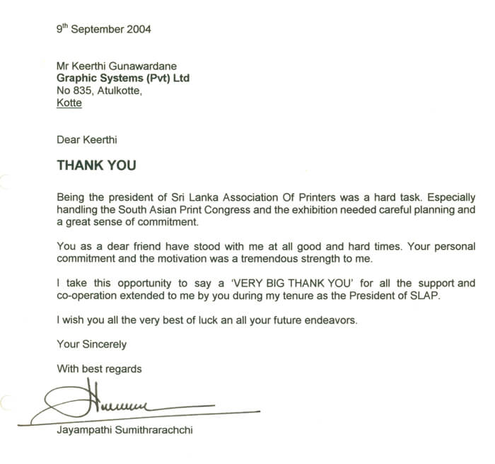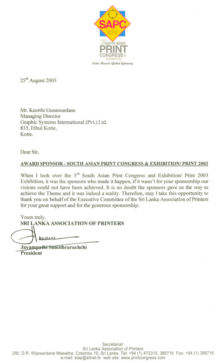 “At the end of a very successful programme, I wish to extend my sincere thanks and appreciation to you for your assistance and support towards the overall success of the ‘President Meets President programme’, by way of printing all our material meticulously. (Both Programmes).“