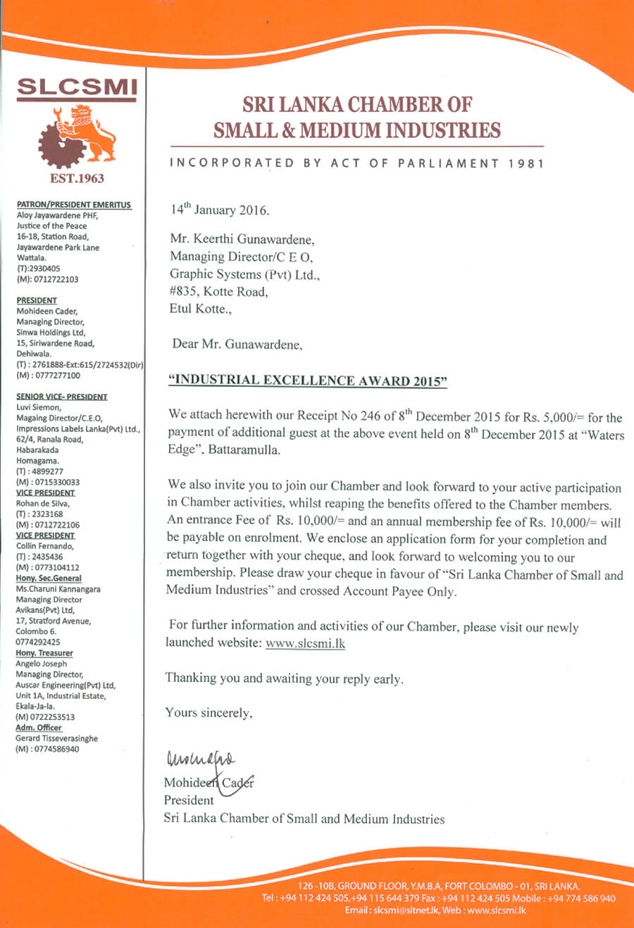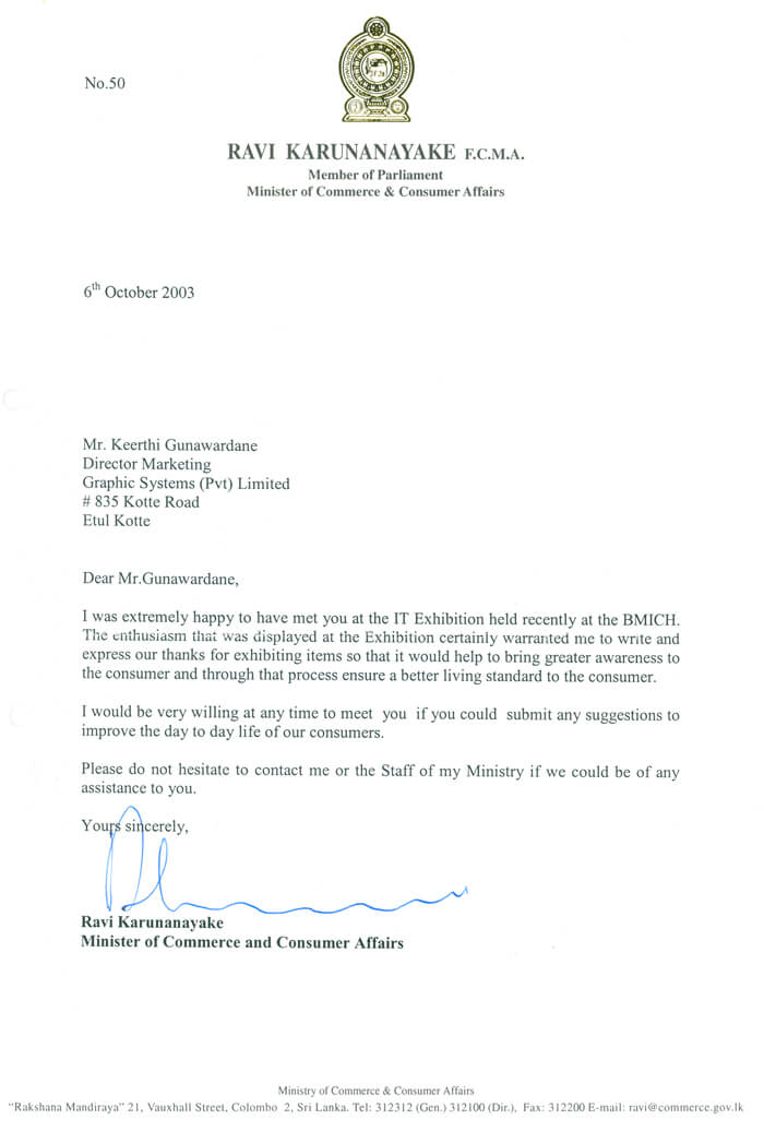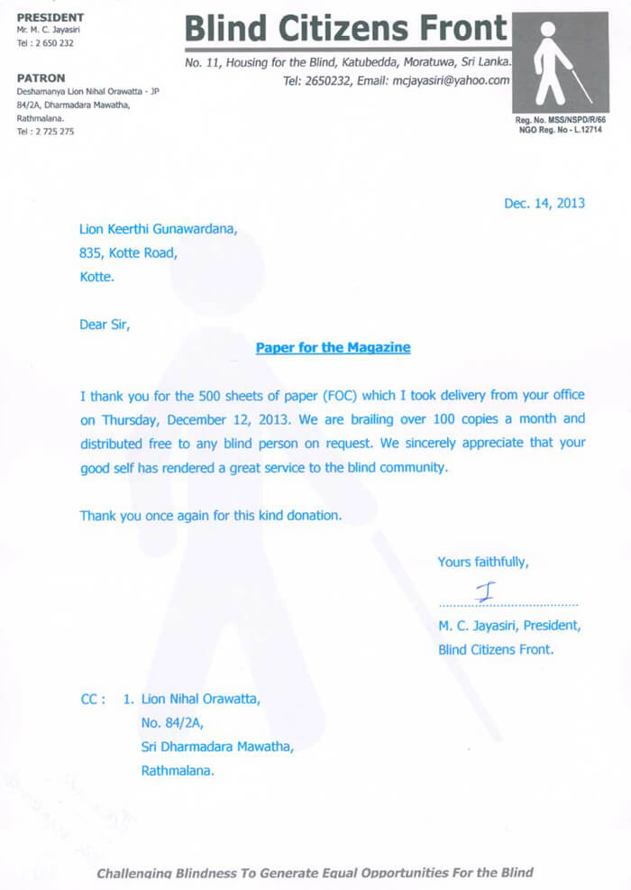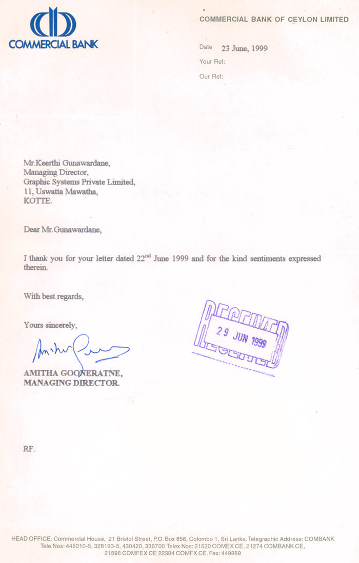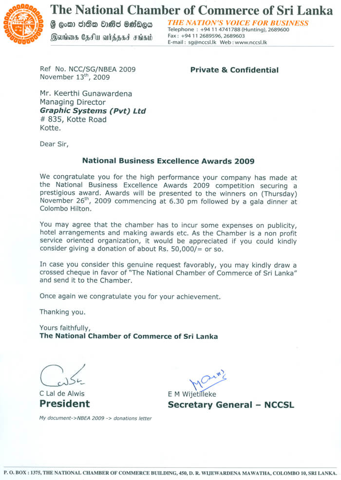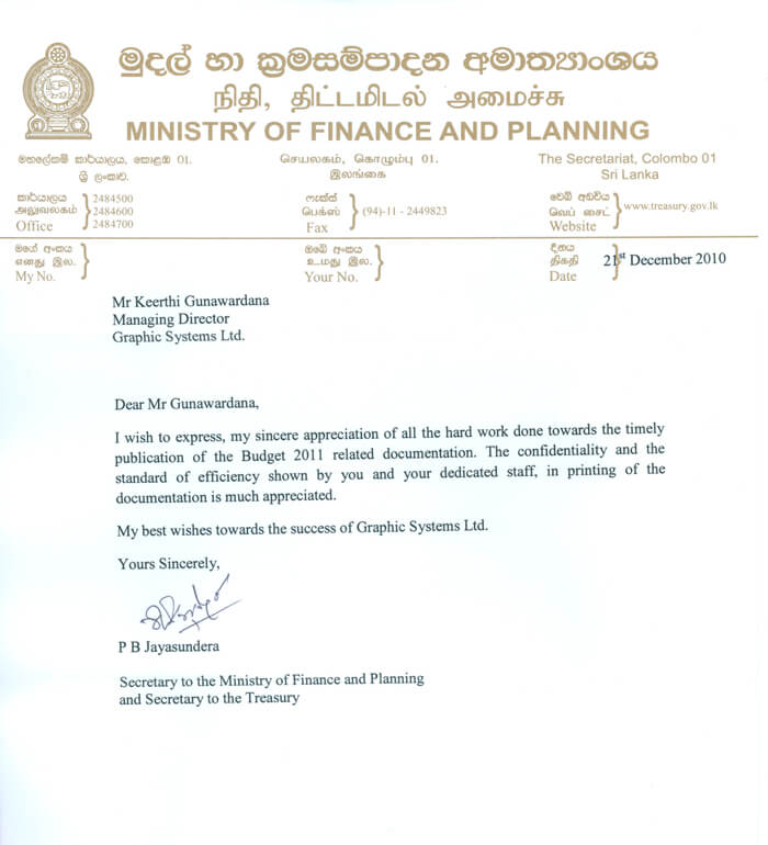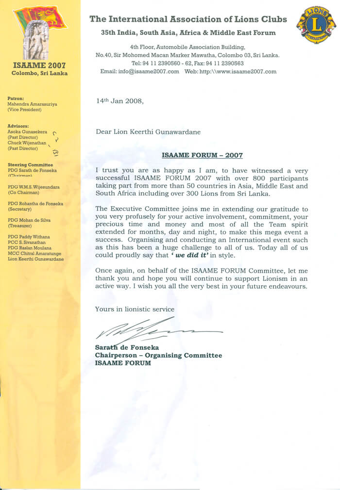 “At the end of a very successful programme, I wish to extend my sincere thanks and appreciation to you for your assistance and support towards the overall success of the ‘President Meets President programme’, by way of printing all our material meticulously. (Both Programmes).“